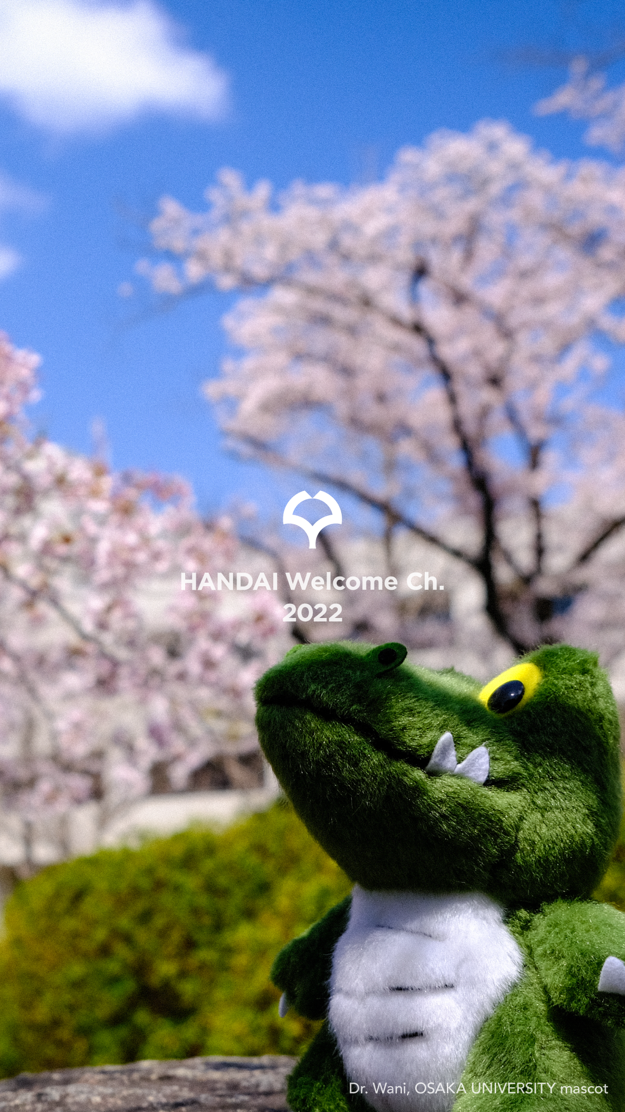 桜が満開の浪高庭園に佇むワニ博士の壁紙です。